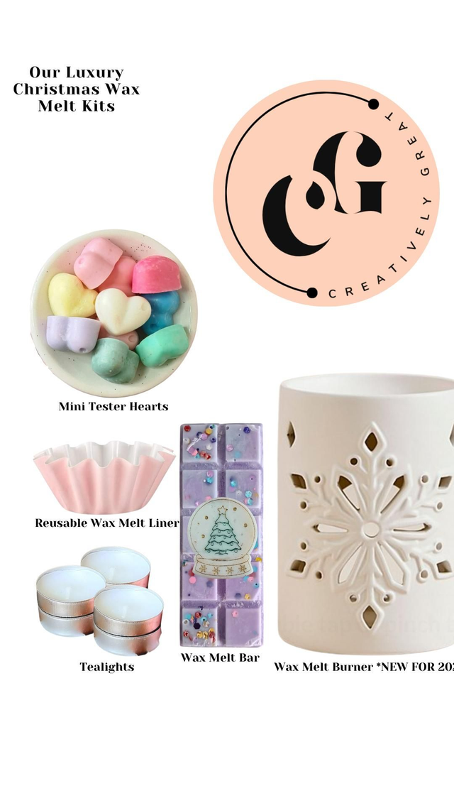 Our Luxury Christmas Wax Melt Kit has that extra Christmas sparkle. Transform your home into an aromatic oasis with our Beautiful Wax Melt Kit! Ideal for beginners and seasoned pros, this kit includes a ceramic oil burner, heart-shaped wax melts, a full-size wax melt bar, mini tea lights, and a wax melt liner. With everything you need at your fingertips, you can fill your space with delightful scents in no time. Get your hands on our Home Fragrance Bundle today!
